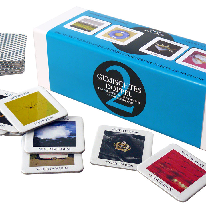 GEMISCHTES DOPPEL 2 - Mehr verdrehte Wortpaare des sprachkreativen Kult-Memospieles wie Fastentee – Tastenfee, in der zweiten Ausgabe im weißen Karton. Ab sofort beginnt wieder das sprachkreative Suchen nach weiteren Anagramm-Paarungen, die Sinn machen und Spaß bereiten. Auch diese Ausgabe fördert Erinnerungsfähigkeit, Sprachvermögen und Assoziationskunst. „Ein kniffliges Spiel für Querdenker, Wortakrobaten und Gedächtniskünstler.“ Brigitte Geschenke