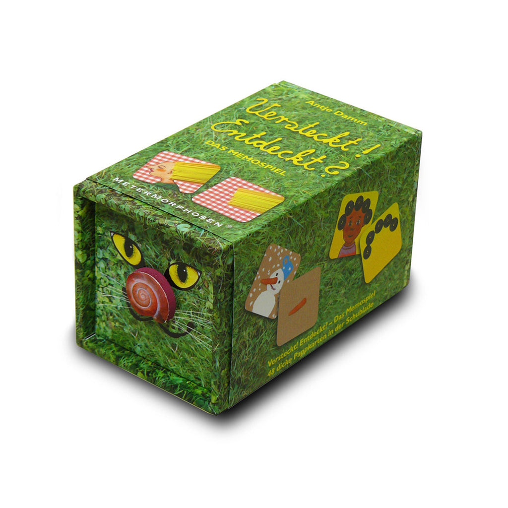 VERSTECKT! ENTDECKT? Ein neues kreatives Memospiel voller Assoziationen, gestaltet von der bekannten Kinderbuch-Illustratorin Antje Damm. Aus einem Alltagsgegenstand wird bei diesem kompakten Memospiel im Handumdrehen ein Gesicht – oder man ist aufgefordert, anders herum die manchmal gut versteckten Dinge in den Gesichtern zu entdecken. So ist Versteckt! – Entdeckt? eine Weiterführung des MeterMorphosen-Memo-Klassikers Was ist das?, bei dem Alltagsgegenstände in Tiere verwandelt werden. Im neuen Spiel gilt es nun, Paare zusammenzufinden, bei denen ein Gegenstand in ein Gesicht verwandelt oder darin zu finden ist. Aus Spaghetti wird eine Haarpracht, aus einem Pfannkuchen eine Gesichtsform, aus einem Schlüssel eine Brille und aus dem Bauchnabel wird ein Mund. ISBN 978-3-934657-65-6